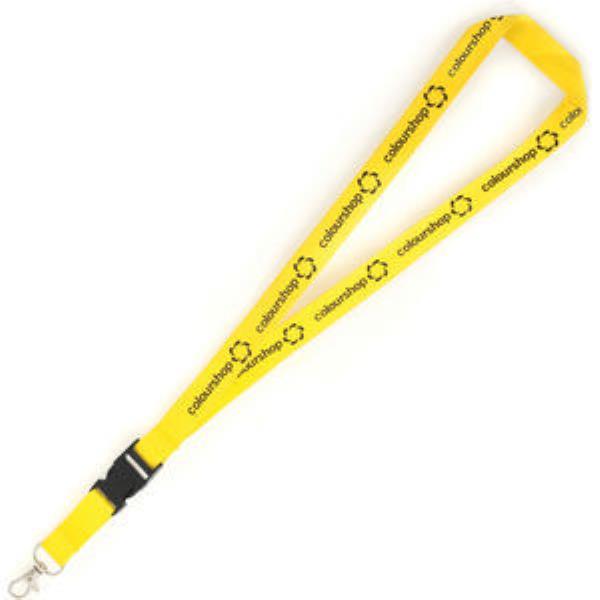 Polyester lanyard with metal hook and plastic buckle release. Size: 10 , 15, 20 or 25 mm width. Price shown is for 20 mm width