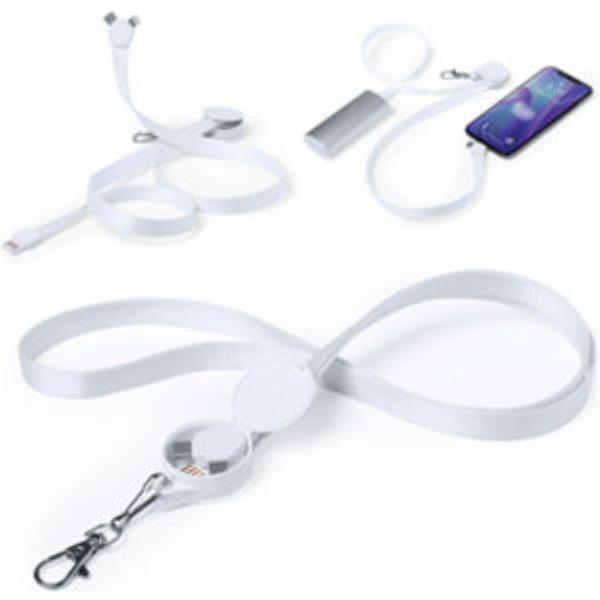 Lanyard charger with TypeC and dual micro USB/Lightning connections. With a neat design enclosure for connectors, especially designed for pad printing. 52cm length, with metal carabiner accessory and in resistant 300D, white colour polyester.