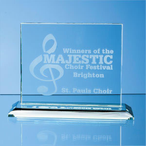 With a subtle hint of jade this horizontal rectangular transparent glass award is mounted on a matching highly polished plinth. In three sizes each award is 12mm thick and is available in 9cm x 12cm 12.5cm x 15cm shown and 17.5cm x 20cm sizes. Each item is ideal as a standalone award but can also be used as 1st 2nd and 3rd place achievement awards or sporting event prizes. There is a generous area that can be engraved with a crest company logo or message. It comes complete with its own presentation box. Print method offered on the product is Digital Colour Printing, Decal(Low Fire Colour Printing), Sandblast Engraving, Sub Surface Engraving. Also available CGi Colour3D, Colour Infill print method contact us for details.