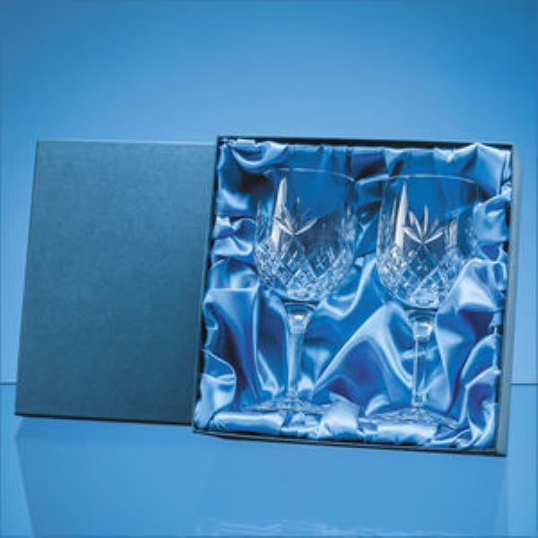 Adding elegance and style to any dinner table this Blenheim classic lead crystal goblet gift set of two 280ml glasses is cut in a classic diamond and wedge pattern. Perfect for a generous glass of white wine and with a long stem it is off-set in a deluxe satin lined presentation box. It would make a superb award or gift for any occasion and the perfect companion to any other pieces from the Blenheim collection. Print method offered on the product is Sandblast Engraving. Also available Colour Infill print method contact us for details.