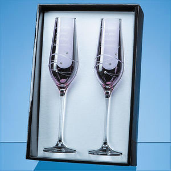 Two elegant, long stemmed champagne flutes with a romantic pink tint are the perfect gift or memento for an engagement, wedding, birthday or anniversary. Finished beautifully with a delicate spiral cut pattern and three sparking Swarovski Diamante crystals there is space to personalise this gift with the engraving of an inscription, message or date. They are packaged in a beautiful presentation box.