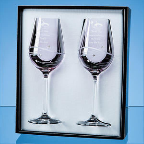 A stunning gift or memento of a special occasion such as a wedding, engagement, birthday or anniversary, these two elegant, long stemmed wine glasses have a romantic pink tint to make them extra special. And with a delicately etched spiral cut design and three sparkling Swarovski Diamante crystals placed along the swirl they will add a touch of glamour! There is an engraving space at the top of the glass where a date, names, inscription or message can be added. They are packaged in a beautiful presentation box.