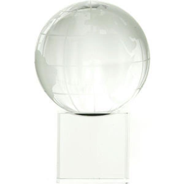 60mm crystal globe on a clear cube, 90mm high supplied in a satin lined box. This is a two piece trophy where the cube has an indent which the globe sits into. Also available with a black cube.