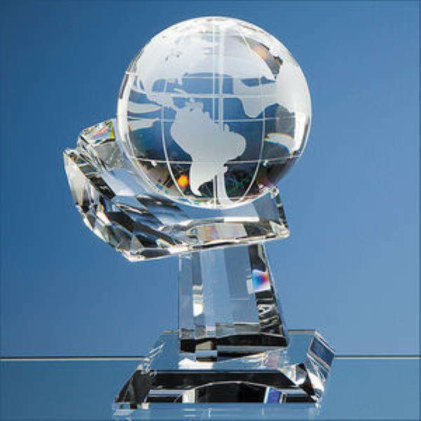 The Globe on Hands are very effective and stylish, the globe spins freely on the hand having been hand crafted out of perfectly clear optical crystal. They are available in 3 sizes and are ideal recognition, achievement or incentive gifts for global, travel or transport based companies. They can be personalised with any crest, logo or wording to create an award that is sure to take pride of place when put on display at home or at work. They are supplied in a black foam lined presentation box. Print method offered on the product is Sandblast Engraving. Also available Colour Infill print method contact us for details.
