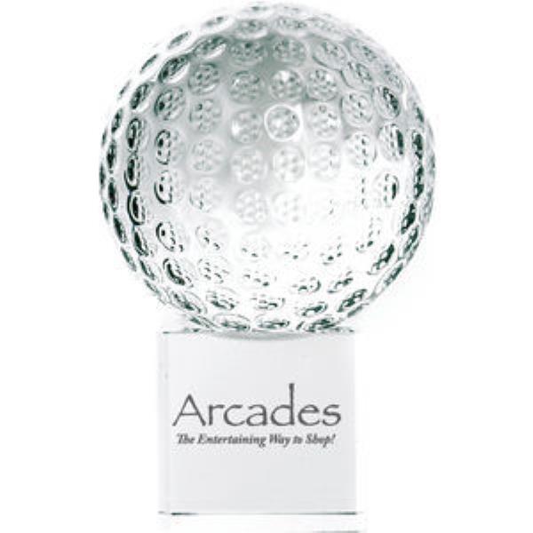 60mm crystal golf ball on a clear cube, 90mm high supplied in a satin lined box.This is a two piece trophy where the cube has an indent which the golf ball sits into. Ideal award for golf presentations.