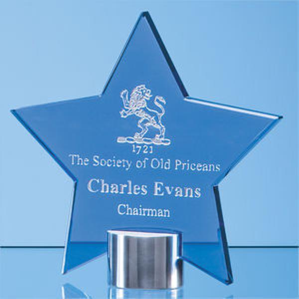 A fun simple award that is a great choice for recognising achievement or acting as an incentive. The cobalt blue glass star is mounted onto a sturdy brushed aluminium base making it free standing. For extra impact use infilled engraving to add some colour to the award it looks particularly stunning with a metallic infill. Print method offered on the product is Decal(Low Fire Colour Printing), Sandblast Engraving. Also available Colour Infill print method contact us for details.