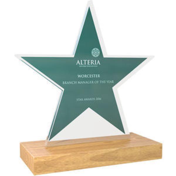 Bespoke Shaped Acrylic Awards with Real Wood Base - small