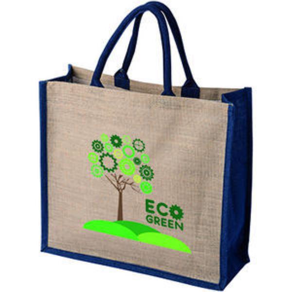 Made from 100% Natural Jute with inside PP lamination and 40cms Web handle. Available in a range of different colours. Dyed navy gussets and handles