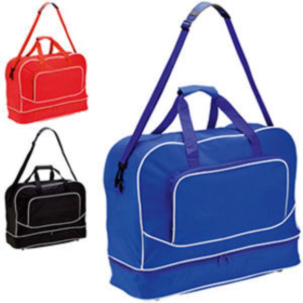 600D polyester sports bag with main zipped compartment, front zipped pocket, bottom zipped shoe pocket, carrying handles and adjustable shoulder strap.