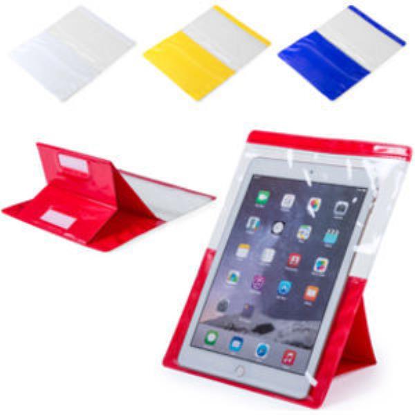 Multipurpose waterproof tactile PVC pouch/bag with touch screen and fold out velcro stand. Suitable for tablets.