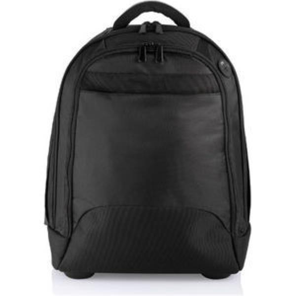 1680D metal look wheels, aluminium trolley handle, padded 15.6 laptop compartment, extendable waist, front pocket with organizer, lined handle and (removable) shoulder straps.