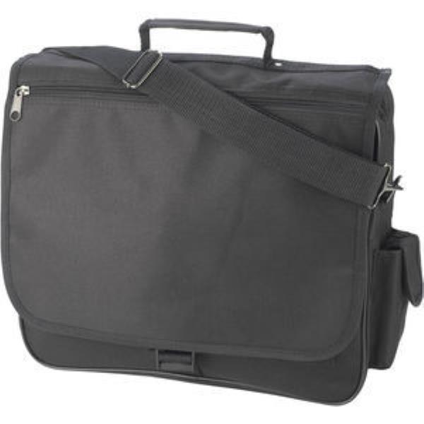 Ramsden Bag Black Bag in 600D Polyester with shoulder strap zipped main compartment and various pockets under the front flap. Also available in blue.