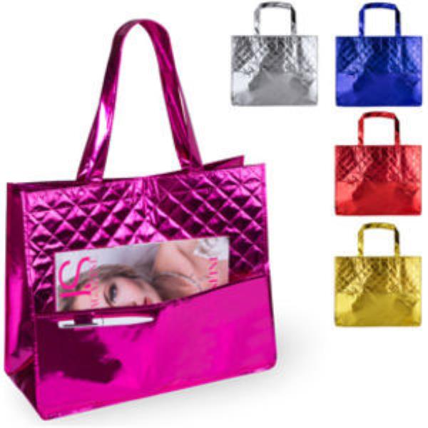Laminated Non-woven bag with gusset, side pocket and pen loop.