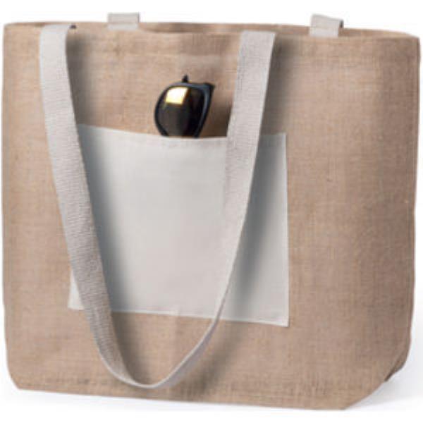 Jute and cotton shopping tote bag with long handles. This large bag has an unzipped front pocket made of cotton. Perfect for everyday use and grocery shopping.