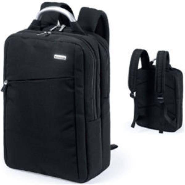 Padded black laptop and tablet backpack made with durable polyester with padded back and shoulder straps. Two zipped main compartments with one zipped front pocket. Laptop and tablet slip pocket in one main compartment. Internal mesh phone holder with zipped closure.