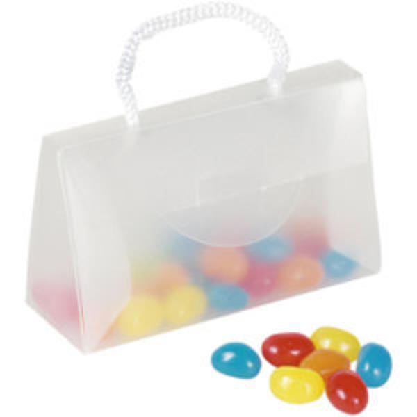 50g bags sweets in translucent perspex bag with a transparent window for a full colour personalised insert. Sweets Available: Chocolate, Jelly Beans, Candy Hearts.