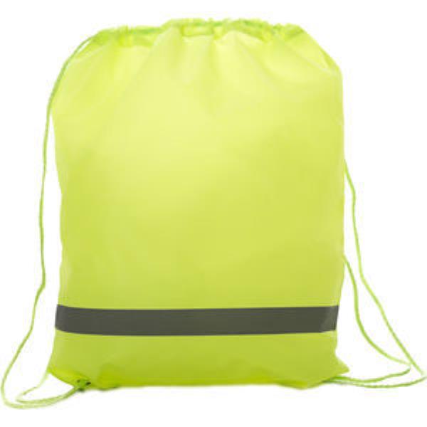 Premium 210D polyester rucksack with reflective strip and drawstring handles. Ideal for schools, sports clubs and for safety promotions. 340x430mm. Print area 250x200mm.