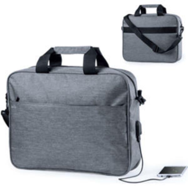 Security document bag in an urban design and in resistant 300D polyester material. Inside pocket with RFID (Radio Frequency Identification) security technology that keeps card and other devices data safe. Protected handles and main compartment with zipper closure. With USB connection power bank not included and inside, padded pockets for laptops up to 15 inches and tablets up to 10 inches. Adjustable shoulder strap with padded protection.