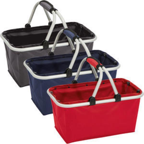 Shopping basket with aluminum frame in different colors, your shopping made easy. We print your logo on one side.