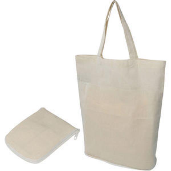 Natural colored, foldable and environmentally-friendly cotton bag (120 grams per square metre) with carrying handle. We print your logo on one side.