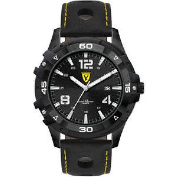 Black chrome plated alloy case, black sunray dial with white luminous printed on silver raised ND indexes, padded black natural leather strap w/white stitching
