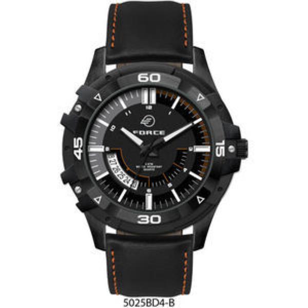 Black chrome plated alloy case, black sunray dial with white luminous printed on silver raised ND indexes, padded black natural leather strap w/orange stitching