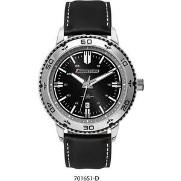 Alloy case, sunray black dial with silver raised ND indexes, padded black natural leather w/white stitching strap