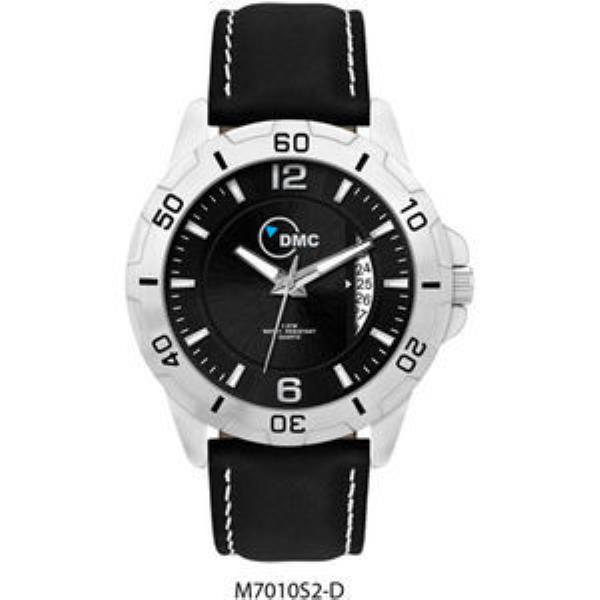 Alloy case, 2-tone black dial with white luminous printed on silver raised ND indexes, padded black natural leather w/white stitching
