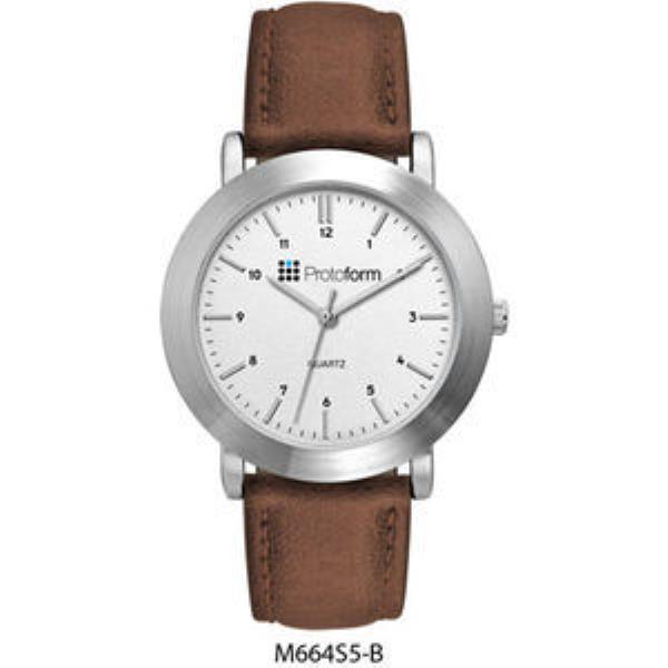 Alloy case, matte silver dial with silver raised ND indexes w/black printed indexes, padded brown natural leather strap