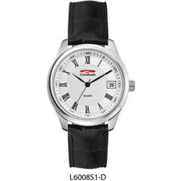 Alloy case, silver dial with black printed indexes, padded black crocodile back pattern leather strap