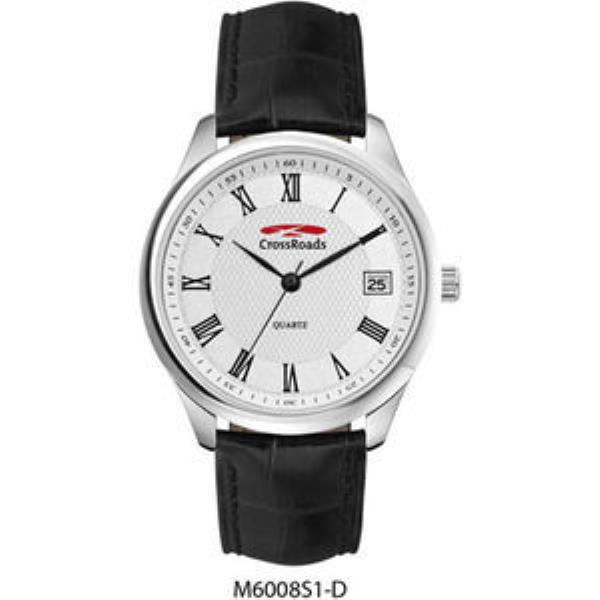 Alloy case, silver dial with black printed indexes, padded black crocodile back pattern leather strap