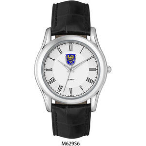 Alloy case, 2-tone silver dial with black printed indexes, padded black crocodile back pattern leather strap