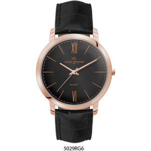 Ionic rose gold plated alloy case, black sunray dial with rose gold printed indexes, padded black crocodile back pattern leather strap