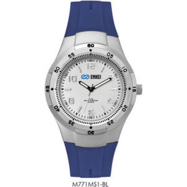 Alloy case, matt silver dial with white luminous printed on silver embossed indexes, blue PU rubber strap