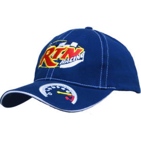 Brushed heavy cotton with tachometer baseball cap. Structured 6 panel, low profile, pre curved peak , short touch strap