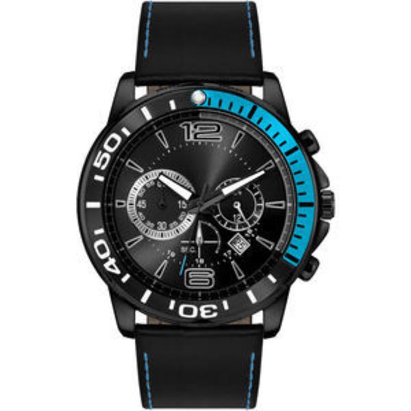Matte Black Plated Case, Black Raised ND Indexes & Details. Black Sunray Dial, Flat Black Natural Leather Strap w/Blue Stitching.