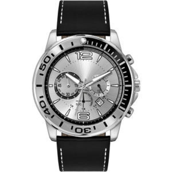 White Luminous Printed on Black Raised ND Indexes, Silver Sunray Dial. Flat Black Natural Leather Strap w/White Stitching.