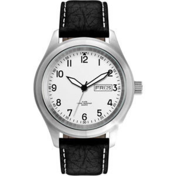Black Printed Indexes, Matte Silver Dial. with Day Date. Padded Black Buffalo Grain Italian Leather Strap w/White Stitching.
