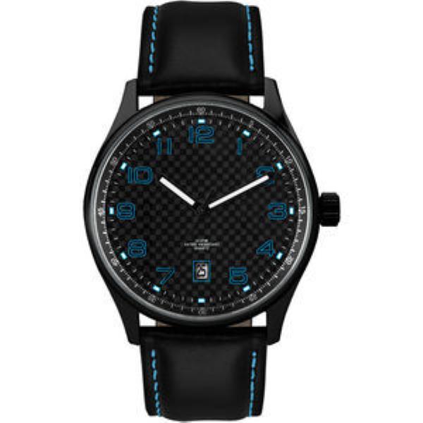 Matte Black Plated Case. White Luminous Printed Indexes, Black Checkers Plated Dial. Padded Black Natural Leather Strap w/Blue Stitching.