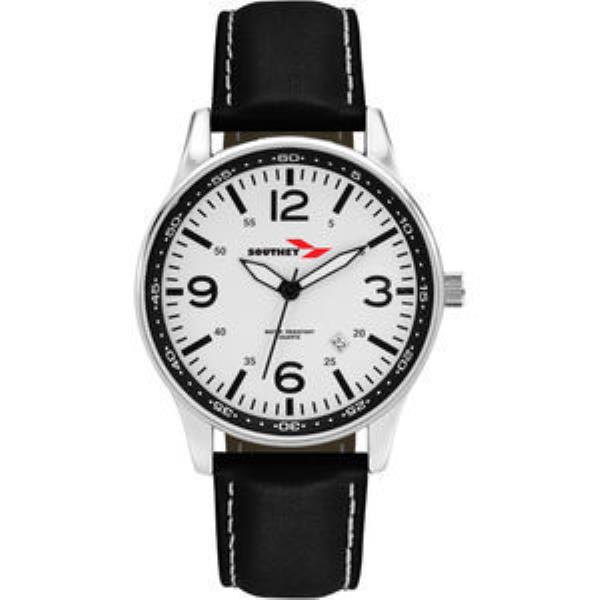 Printed Indexes, White Dial, Padded Black Natural Leather Strap w/White Stitching, with Date