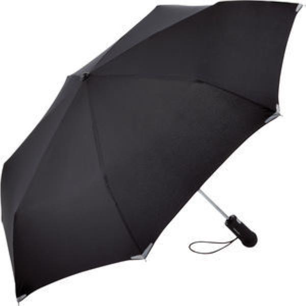 Eye catching automatic open/close mini umbrella with reflective corners and LED light Convenient automatic open/close function for quick opening, high quality windproof system with extremely flexible Fibertec rib construction for maximum frame flexibility in stormy conditions, chromed steel shaft, cover with 3M Scotchlite Reflective Material at the panel corners, water and dirt-repellent cover properties through original Teflon fabric protector, Soft-Touch handle with promotional labelling option and LED light for an optimum visibility in road traffic, light head changeable to continuous white light and flashing red light, awarded with reddot design award 2012. Further Safebrella-umbrellas: 5071, 5171, 5571 and 7571.
