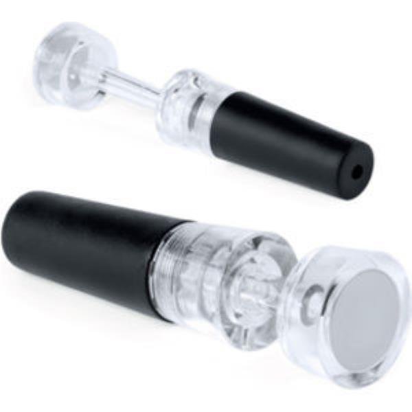 Vaccum lid for wine bottles in an elegant, black colour and transparent design. Upper side of the lid in metal for laser or pad printing. Presented in an individual box.