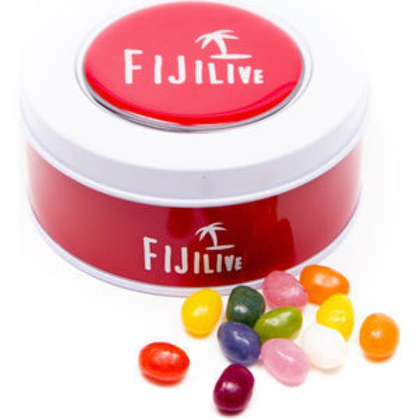 Our Treat tin is fully branded with a digitally printed wrap around the tin and dome label on the lid. Filled with your choice of Gourmet Jelly Beans.