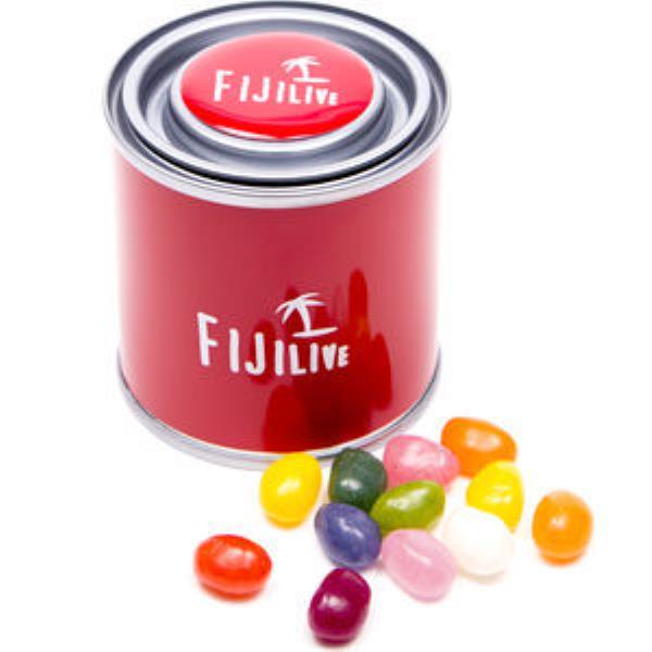 Our mini paint tin is fully branded with a wrap around the tin and dome label on the lid. Filled with your choice of Gourmet Jelly Beans to match with the artwork used.
