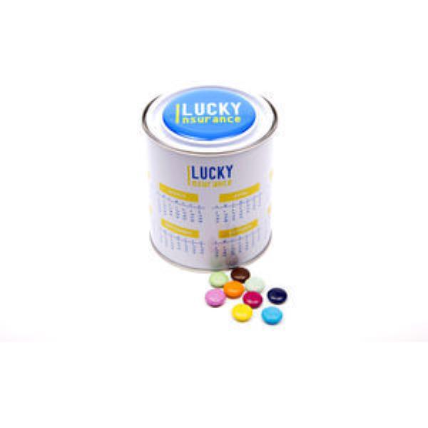 Our large paint tin is fully branded with a calendar wrap around the tin and dome label on the lid. Filled with Beanies to match with the artwork used.
