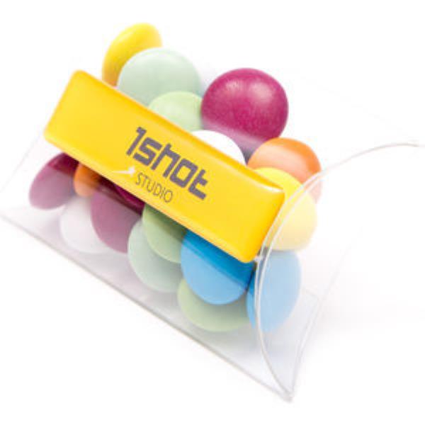 Our clear small pouch, branded with your artwork in full colour on a domed strip or flat label. Filled with your choice of Beanies to match the artwork