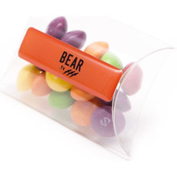 Our clear small pouch, branded with your artwork in full colour on a domed strip or flat label.