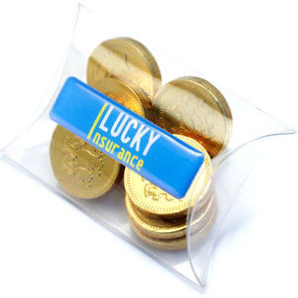 Our clear small pouch, branded with your artwork in full colour on a domed strip or flat label. Filled with Chocolate Coins.