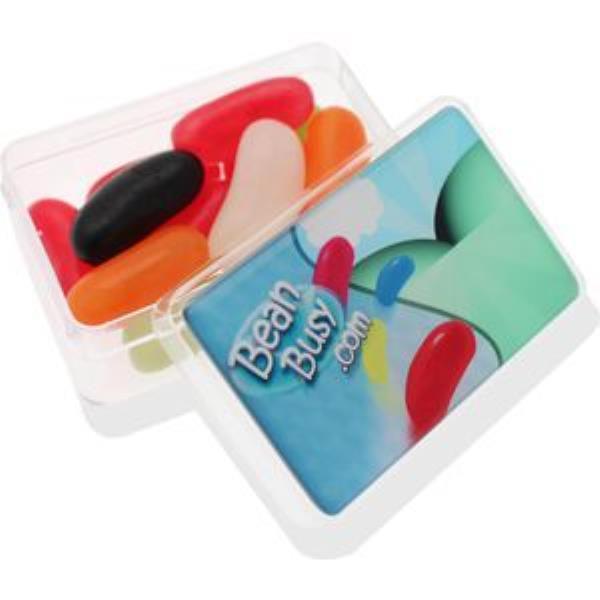 Jolly beans in a Midi Rectangle plastic pot. Up to full colour domed label to the lid
