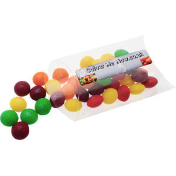 40grams of skittles in a clear plastic pillow pouch. Up to full colour domed label to the top